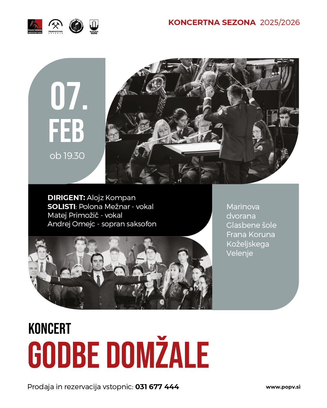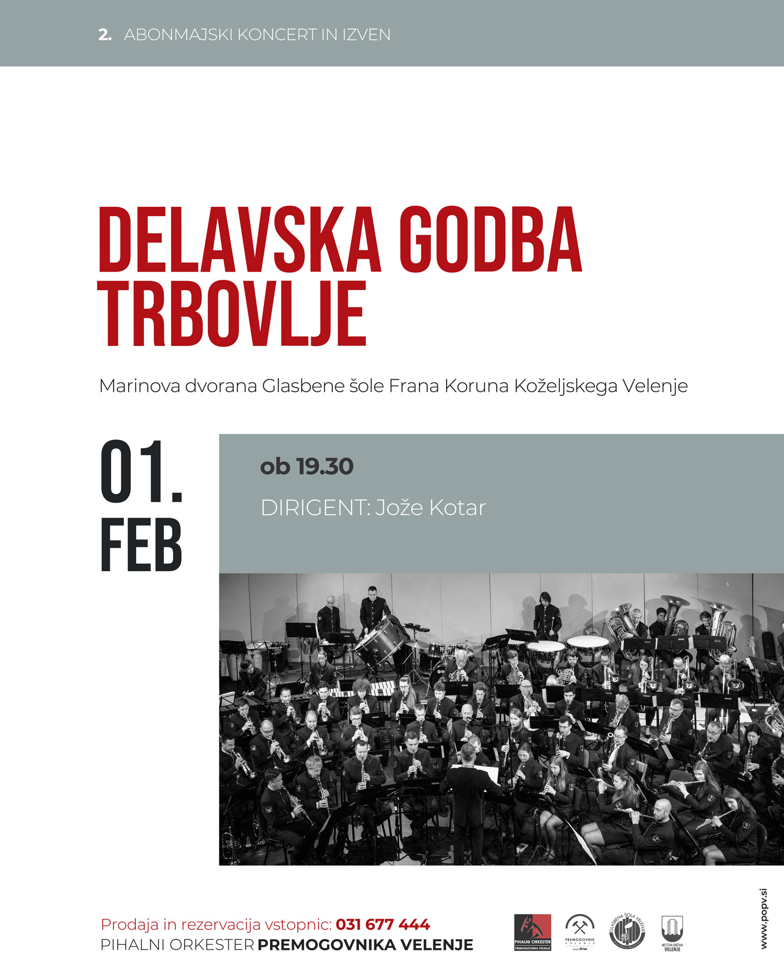 Vljudno vabljeni na 2. abonmajski koncert z Delavsko godbo Trbovlje, ki bo v soboto, 1. februarja, ob 19.30 v Marinovi dvorani Glasbene šole Frana Koruna Koželjskega Velenje.