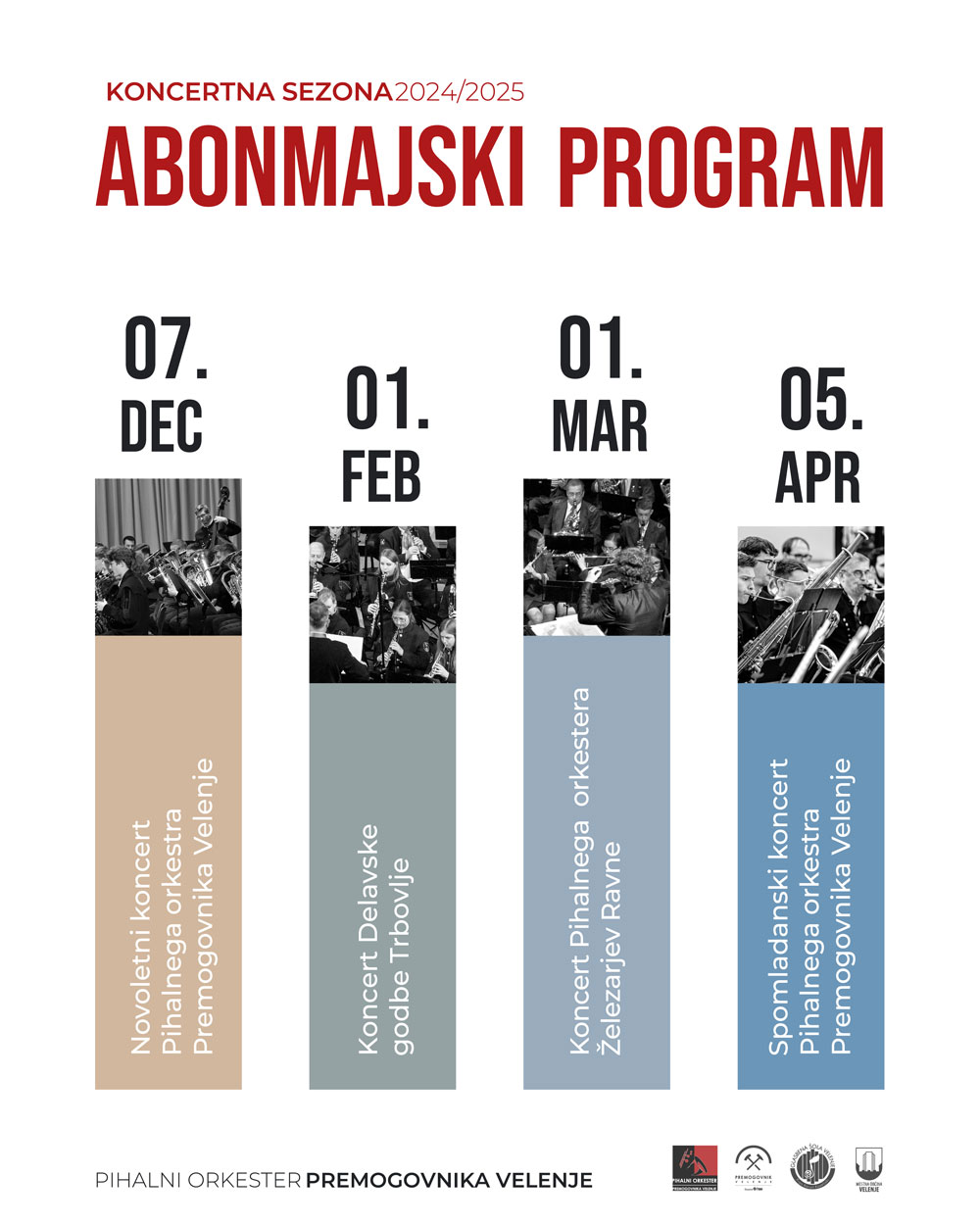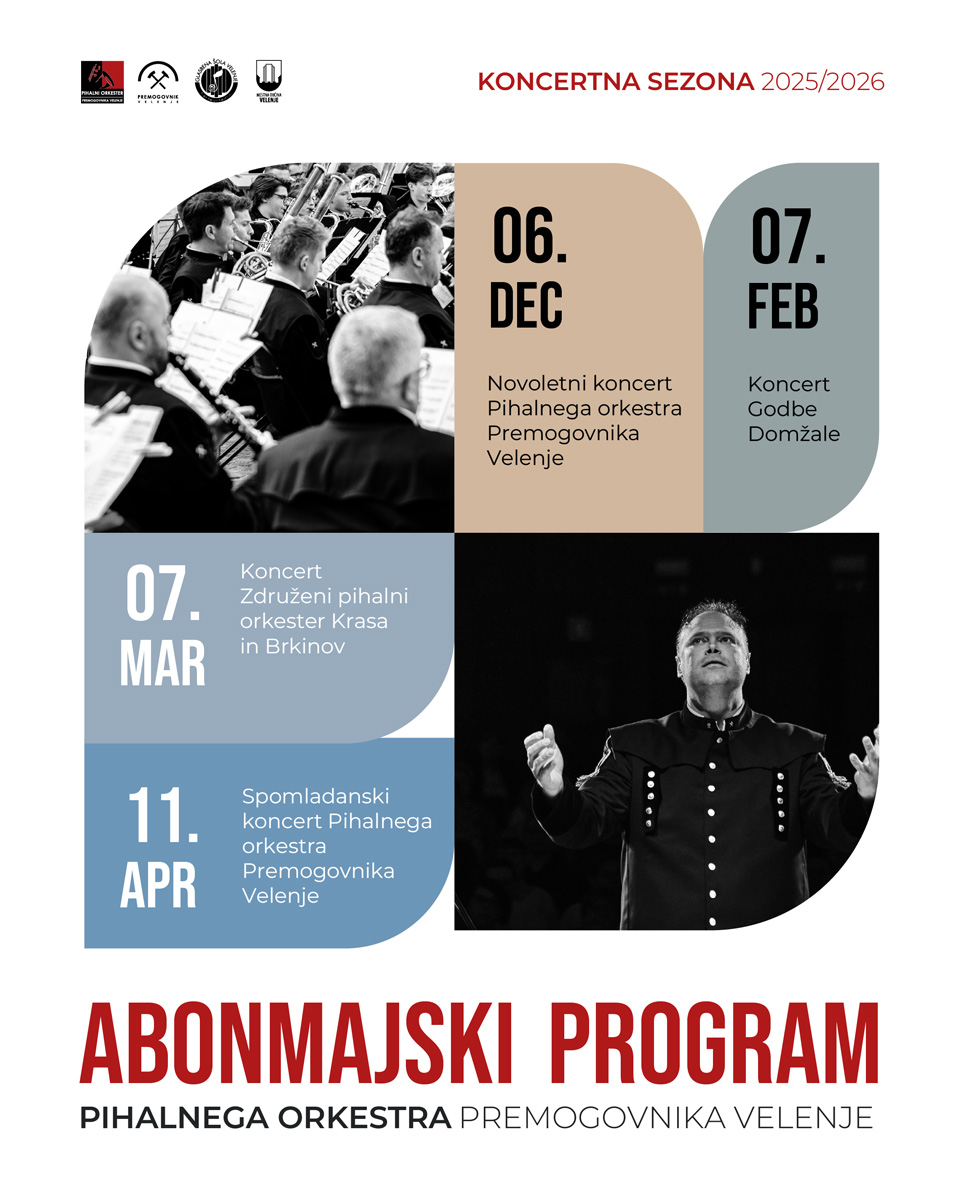 Cenjeni obiskovalci naših koncertov, naši dragi glasbeni prijatelji, z velikim veseljem vas ponovno pozdravljamo ob začetku nove, že 17. abonmajske sezone Pihalnega orkestra Premogovnika Velenje. Glasba je univerzalni jezik, ki nas povezuje, navdihuje in odpira vrata v svet čustev in umetniškega izražanja. Vsako leto se trudimo ustvariti program, ki bo zadovoljil tako ljubitelje klasičnih mojstrovin kot tudi tiste, ki uživajo v sodobnejših glasbenih izzivih.